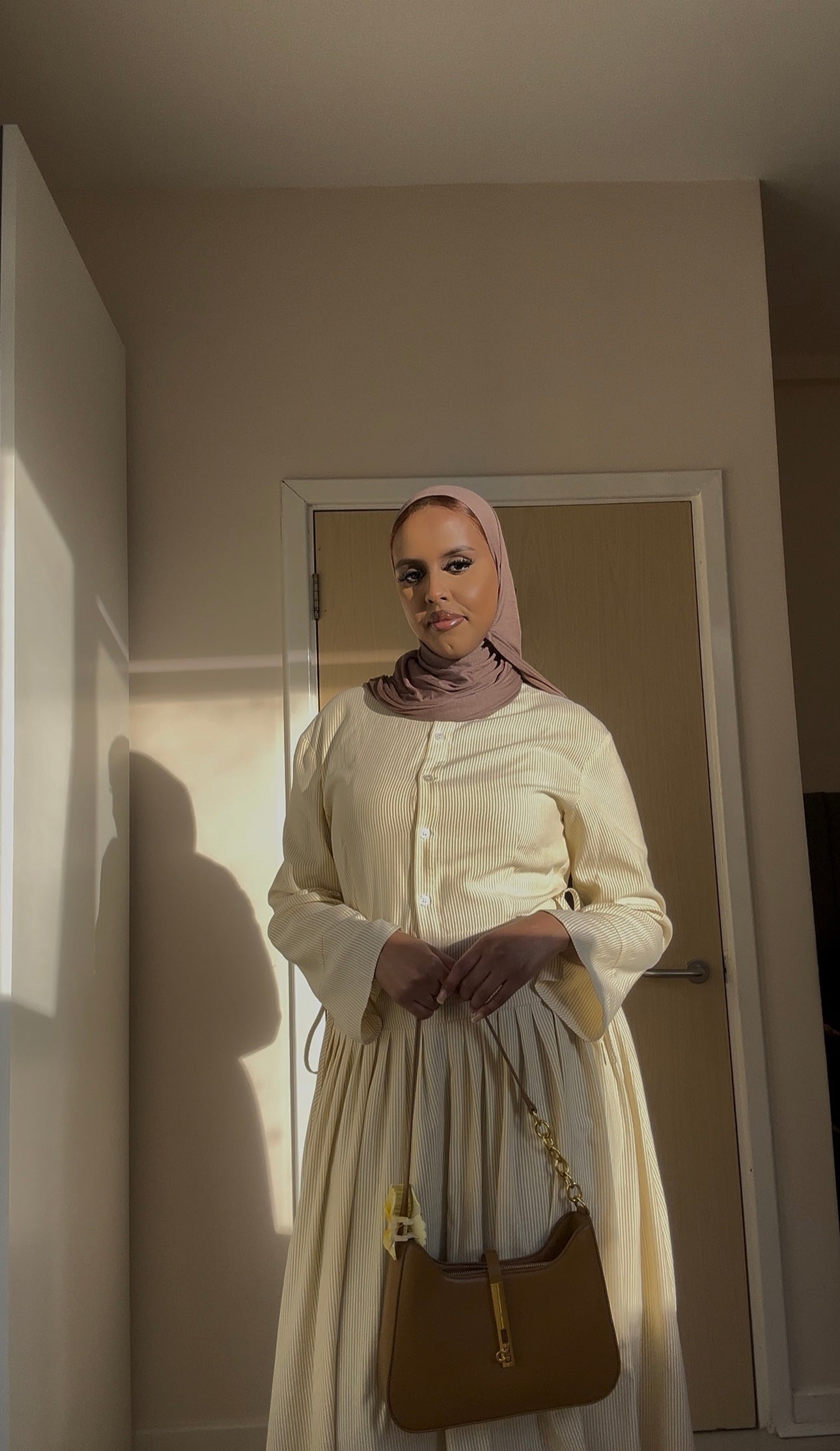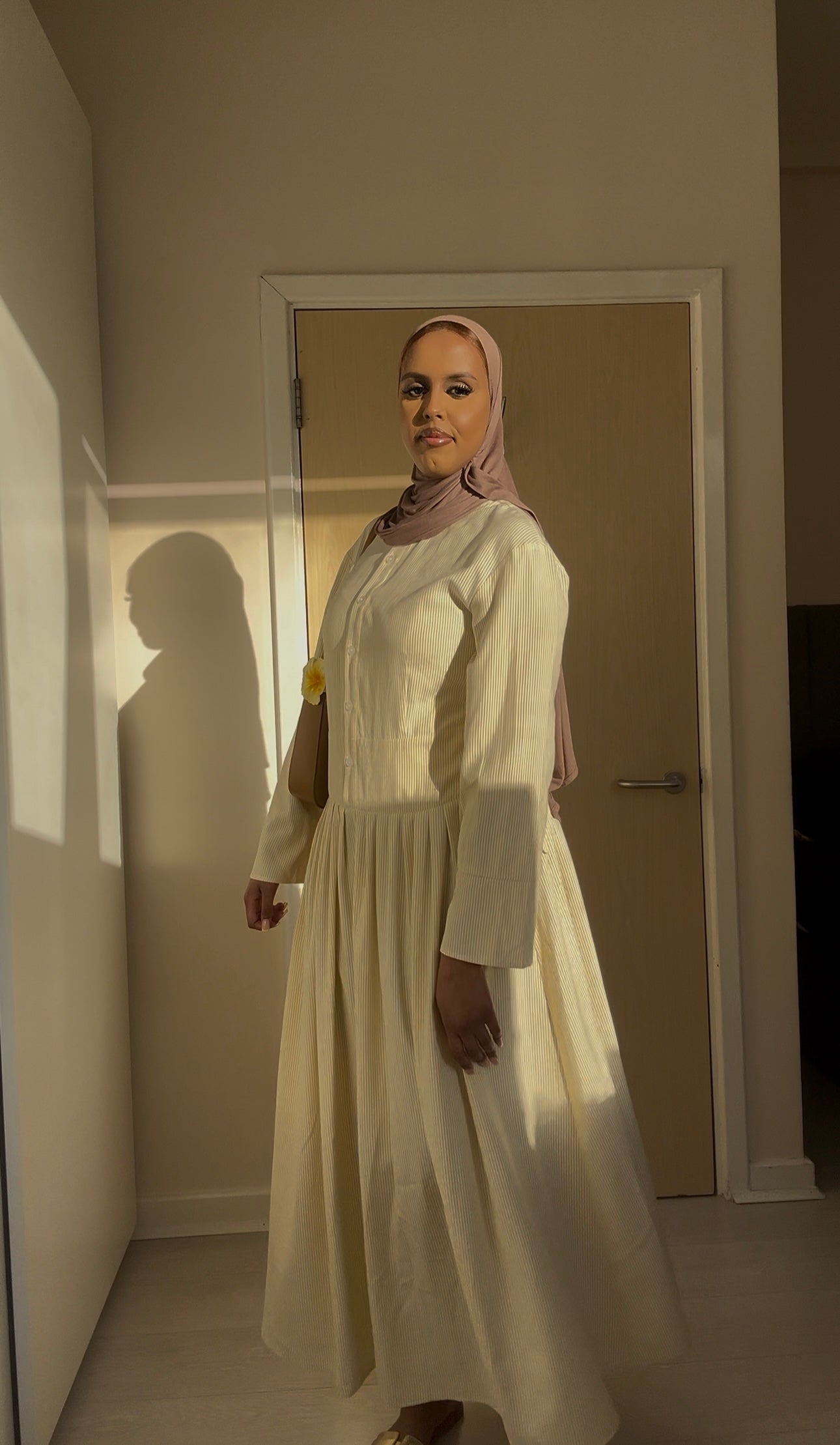 Its soft butter yellow and white pinstripes flow effortlessly, inspired by the warmth of sunshine. The breathable fabric moves with you, ensuring comfort throughout the day.