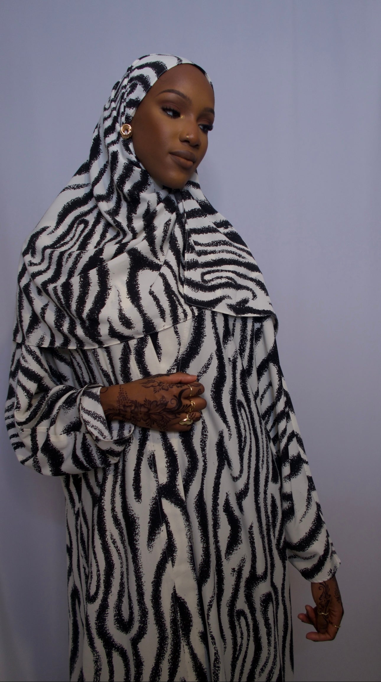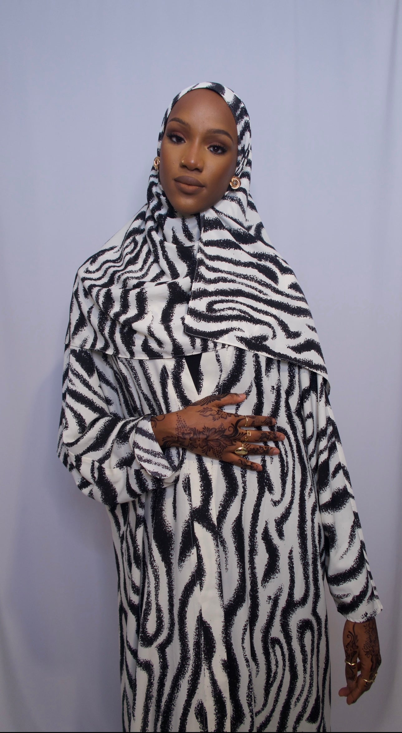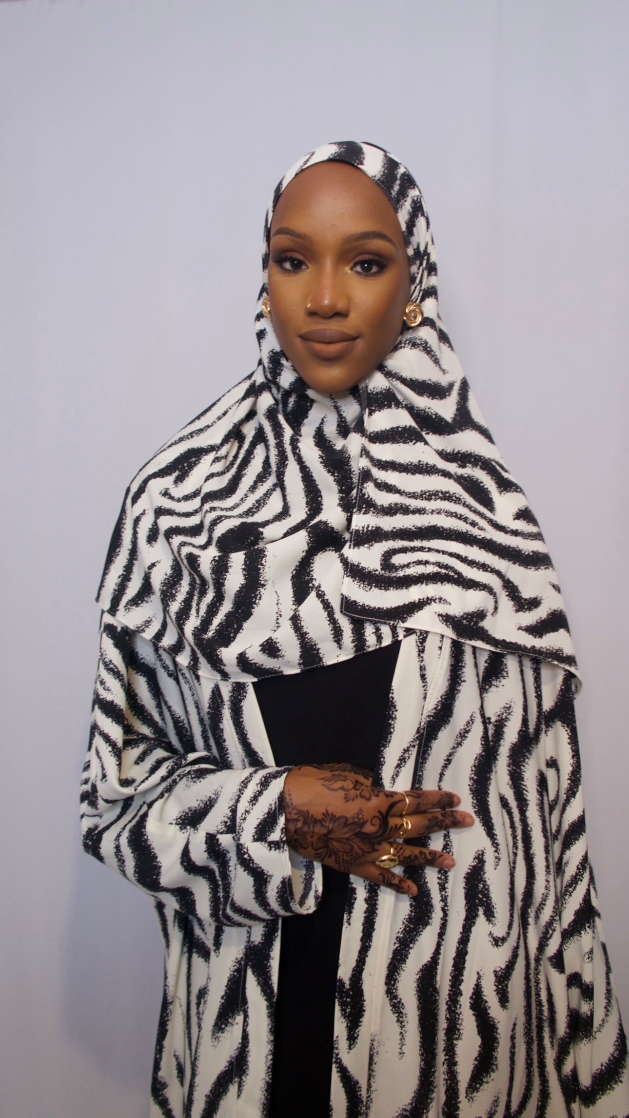 This elegant black and white swirl design abaya, accompanied by a matching hijab, features a striking pattern that effortlessly blends modern art with timeless sophistication. The smooth, flowing fabric ensures comfort and grace, while the bold design makes a fashionable statement. Ideal for both formal and casual occasions, this abaya combines contemporary flair with classic style, offering a versatile and chic option for any wardrobe.