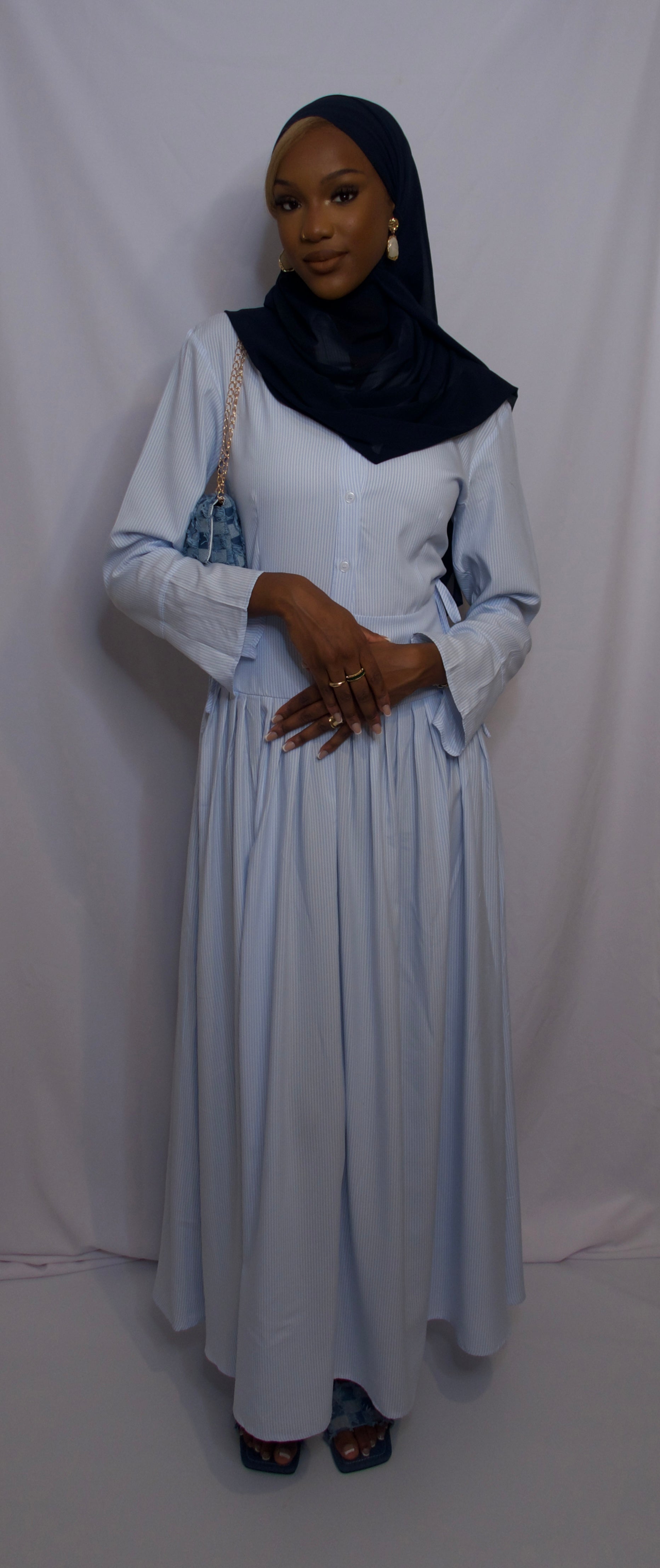 Designed for women 5’9” and above, the Tall Sema Dress offers a perfect fit without compromise. Its soft blue and white pinstripes flow effortlessly, inspired by the tranquility of the sky. The breathable fabric moves with you, ensuring comfort throughout the day.